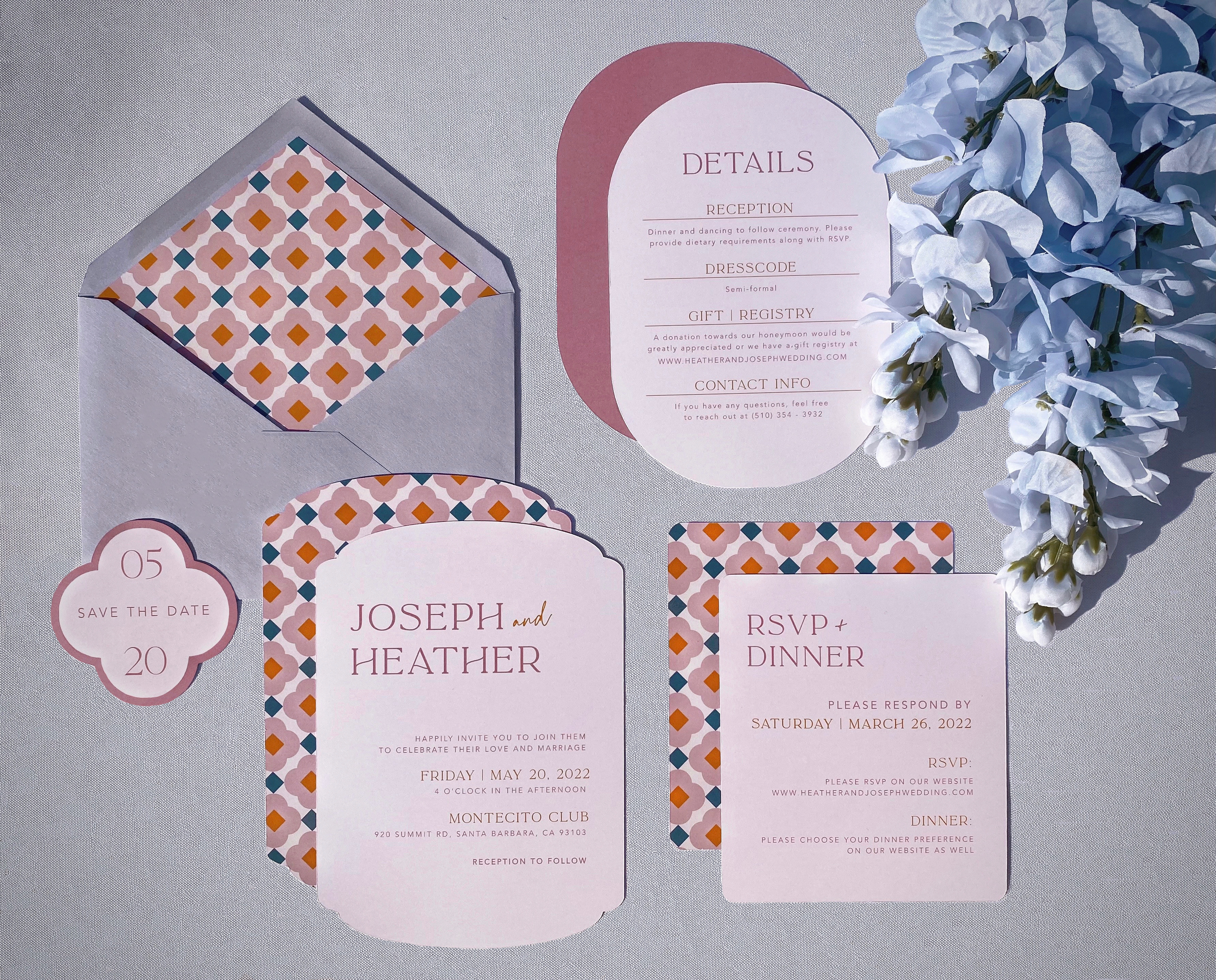 This Santa Barbara wedding consists of invitations and day-of signages. The overall design captures a boho modern-chic, Mediterranean vibe infused with inspiration from the vibrant textiles found in the city of Santa Barbara, located in central California. The invitations, menu shapes, and font choice reflect the graceful curves found in the city's architecture and home designs. Drawing from Santa Barbara's renowned ceramic tiles, the brand identity incorporates geometric pattern illustrations, adding a touch of the city's essence. The color palette used throughout the applications takes cues from the colorful ceramic tiles, but with a muted tone to create a softer and more romantic ambiance.